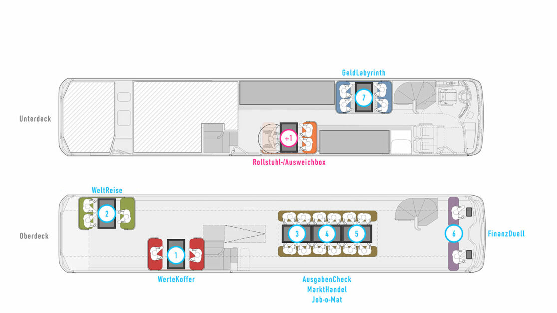 FLiP2Go ist eine fahrende Ausstellung, die Kindern und Schulklassen einen Einblick in Welt der Finanzen ermöglicht. Ein Rundgang aus sieben interaktiven Stationen vermittelt dabei spielerisch Finanzthemen wie Welthandel, Herstellungsprozesse, Budgetplanung, Berufswahl und mehr.