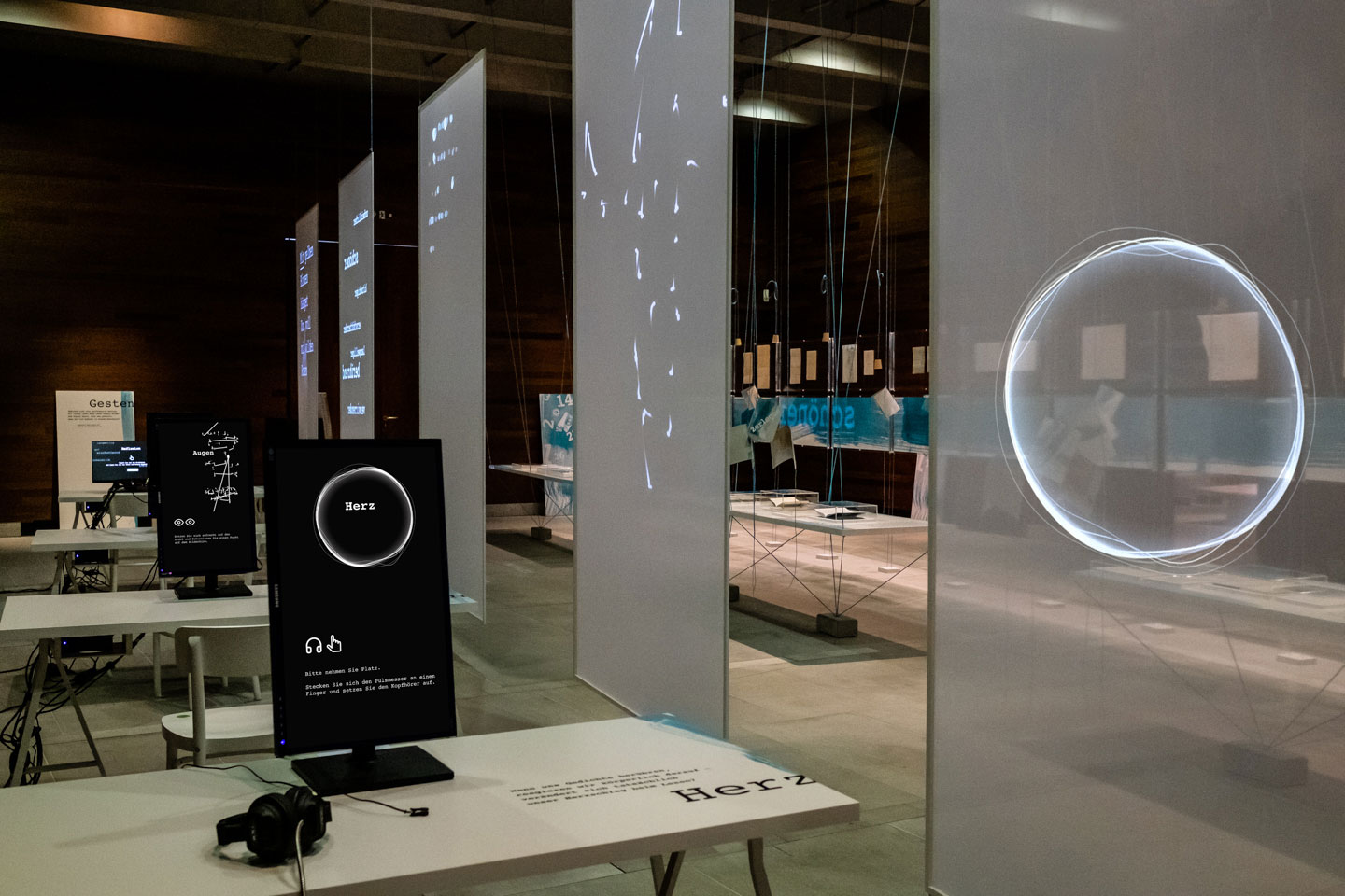 Wie fühlt sich ein Gedicht an? Wie hört es sich an? Was macht es mit mir wenn ich ein Gedicht vorlese oder versuche es darzustellen? Dies können Besucher in der Sonderausstellung „Hölderlin, Celan und die Sprachen der Poesie“ im Literaturmuseum der Moderne herausfinden. An fünf interaktiven Exponaten können die Besucher in die Welt der Gedichte eintauchen. Ihr Input wird dabei gemessen (Eye-Tracking, Pulsmessung, Gesten- und Spracherkennung) und in live generierte Grafiken übersetzt, die für die anderen Besucher sichtbar, auf Leinwände projiziert werden.